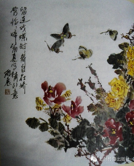 句解:黄四娘家的鲜花遮住了庭前小路,花儿千朵万朵,沉甸甸地,把枝条都压低了。留恋不舍的蝴蝶在百花丛中时时游戏飞舞,安闲自得的黄莺似为我的来到而传出一串娇啼。(甘雨辰 绘)
