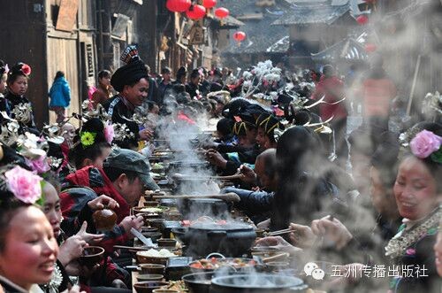 贵州雷山苗寨设长桌宴,与中外游客一起欢度春节。长桌宴是苗族宴席的最高形式与隆重礼仪,已有几千年的历史,通常用于接亲嫁女、满月酒以及村寨联谊宴饮活动。