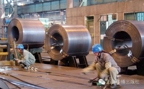 工人正在准备捆扎刚下生产线的X80钢。X80钢是世界上最严格的用钢标准,西气东输工程在国内首次使用了强度更高的X80钢,钢材全部实现了国产化。