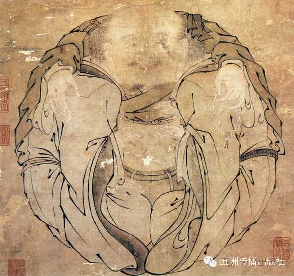 《一团和气图》,粗看是一笑面弥勒盘腿而坐,体态浑圆,细看却是三人合一。左为一着道冠老者,右为一戴方巾儒士,二人各执经卷一端,团膝相接,相对微笑;第三方则手搭两人肩上,露出光光的头顶,手捻佛珠,是佛教中人。作品构思绝妙,人物造型诙谐,用绘画的形式揭示了儒、释、道“三教合一”的主题思想。北京故宫博物院藏,绘于1465年,作者据考证为明宪宗朱见深。