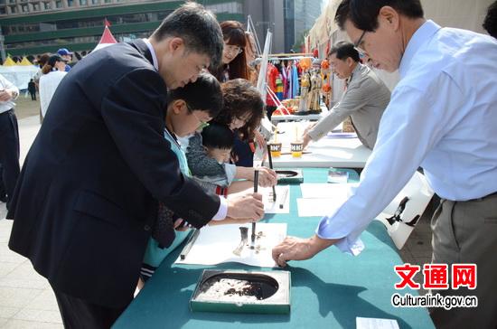 首尔中国文化中心书法教师现场指导书法 (图片来源:文通网)