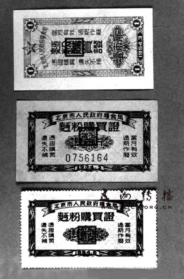 1954年北京市政府粮食局印制发行的面粉购买证。在那个实行计划供应的年代,几乎买所有东西都要票证。