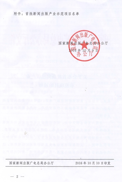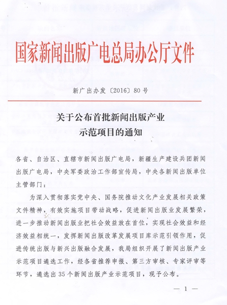 附:国家新闻出版广电总局《关于公布首批新闻出版产业示范项目的通知》