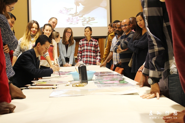 在全英文教学演示过程中,师生亲切交流。中国书画的奇特色彩、情感交织的艺术感染,引起了教学共鸣。