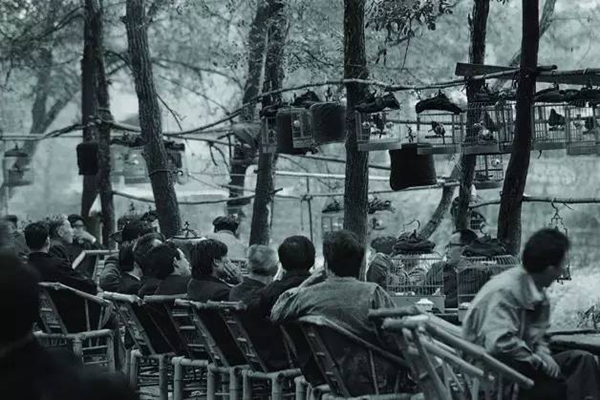 有一群平时喜欢玩鸟的老茶客,这群人都有着较为严格的生活规律:早起带着鸟儿去河畔、公园等清幽场所溜达晨练,至午时回家吃饭,然后小睡一会儿,约下午两点左右再提着鸟笼子陆续相聚于“兰园”。此刻的茶铺是一天中最热闹的时候,约二十张茶桌座无虚席,鸟语人声杂伴相存,弥漫出一派快乐祥和的环境气氛。