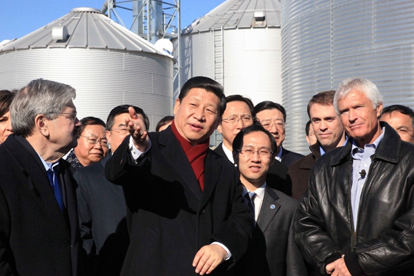 2012年2月16日上午,中国国家副主席习近平重访艾奥瓦州期间,参观位于得梅因附近的金伯利农场,第五次出任州长的特里·布兰斯塔德(左一)陪同。(供图:中新社)