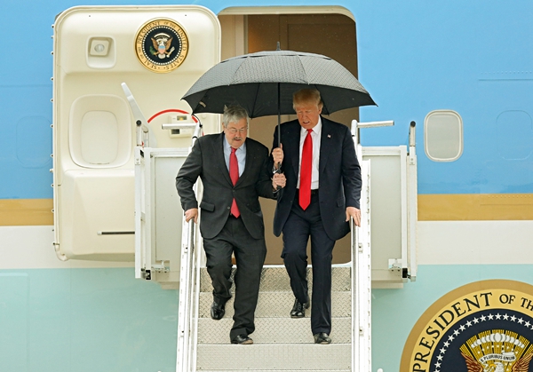 2017年6月21日,特朗普第一次以总统身份访问艾奥瓦州,布兰斯塔德受邀乘坐“空军一号”与总统共同前往该州东部的锡达拉皮兹市参加集会。图为两人共撑一把雨伞走下“空军一号”专机。(供图:gazette)