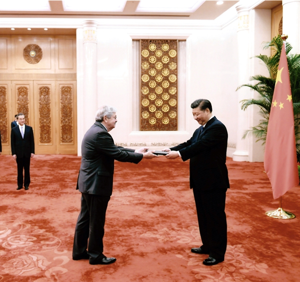 2017年7月12日,美国新任驻华大使特里·布兰斯塔德在北京人民大会堂向习近平主席呈递国书。(供图:美国驻华大使馆)