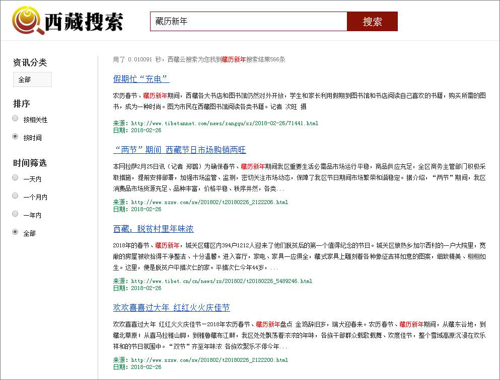 不同于综合性搜索引擎的全网抓取式搜索,“西藏搜索”依托中国知名的西藏专题网站西藏在线网,在搜索西藏相关信息方面更具专业性,来源更可靠,内容真实性更具保障,能够为关注西藏历史、政治、经济、社会、文化、宗教、环保等发展变化的用户实时提供更专业的服务。