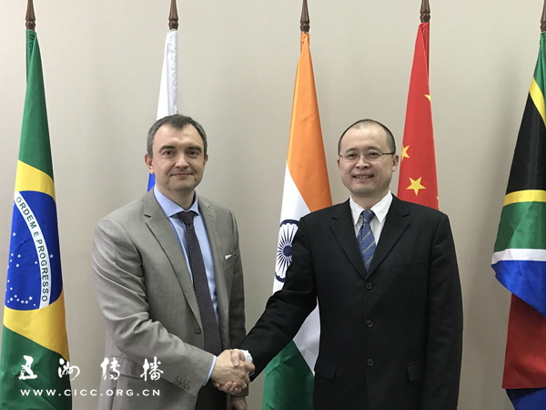 五洲传播中心副主任、 副总编井水清与金砖国家电视频道总裁Pavel Pautov签约
