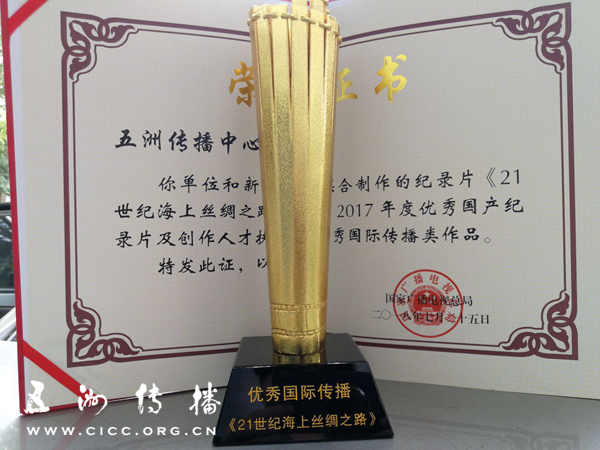 2018年8月4日晚,由国家广播电视总局主办的“记录新时代——第六届国产纪录片及创作人才推优活动”表彰典礼在北京举行。由国务院新闻办监制,五洲传播中心与国外主流媒体联合制作的《智慧中国:众创时代》《21世纪海上丝绸之路》获得国产纪录片优秀国际传播奖,与国内媒体机构联合制作的《崂山传奇》获得国产纪录片优秀长片奖。
