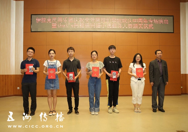 北京外国语大学阿拉伯学院副院长刘欣路(右一)与优胜奖获得者合影。