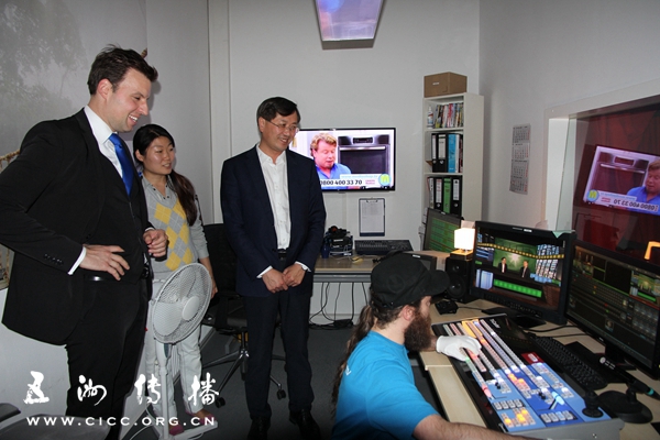 德国当地时间10月8日 “中国吉林电视周” 活动在德国拉开帷幕。当天下午,中共吉林省委宣传部副部长张志伟一行拜访了电视周的德方合作伙伴——莱茵美茵电视台(Rheinmaintv),电视台总经理施图瑟尔(Edmund Stoessel)接待了吉林文化代表团一行,双方共同观看了正在播出由五洲传播中心承制的纪录片《走向世界的中国高铁》。