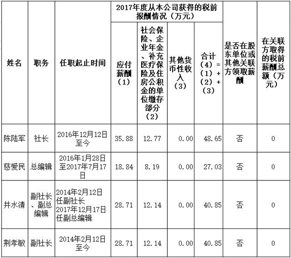 上表披露信息为五洲传播出版社企业负责人2017年度全部应发税前薪酬,按国家规定由单位缴存各种社会保险等。其中,第(1)项由中央宣传部核定。