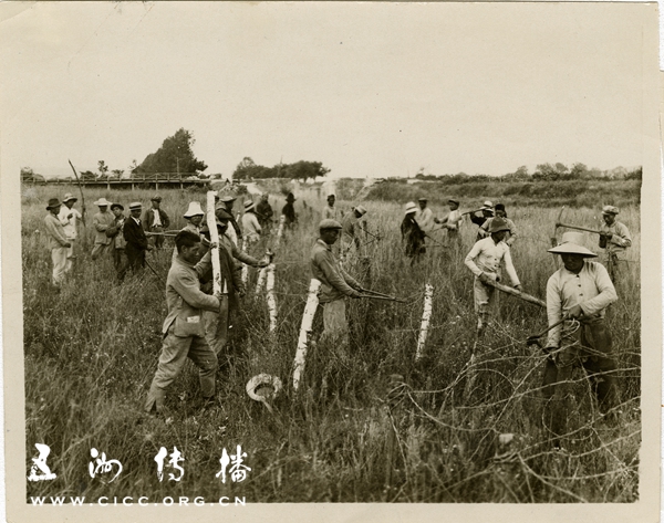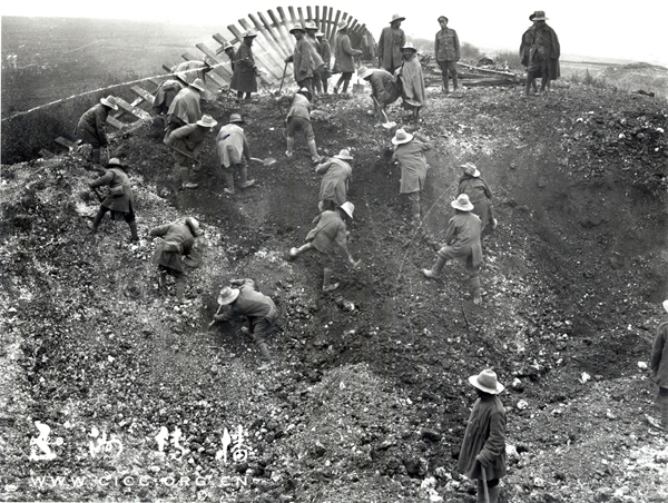 战争结束,华工们在拆除战场上遗留的铁丝网