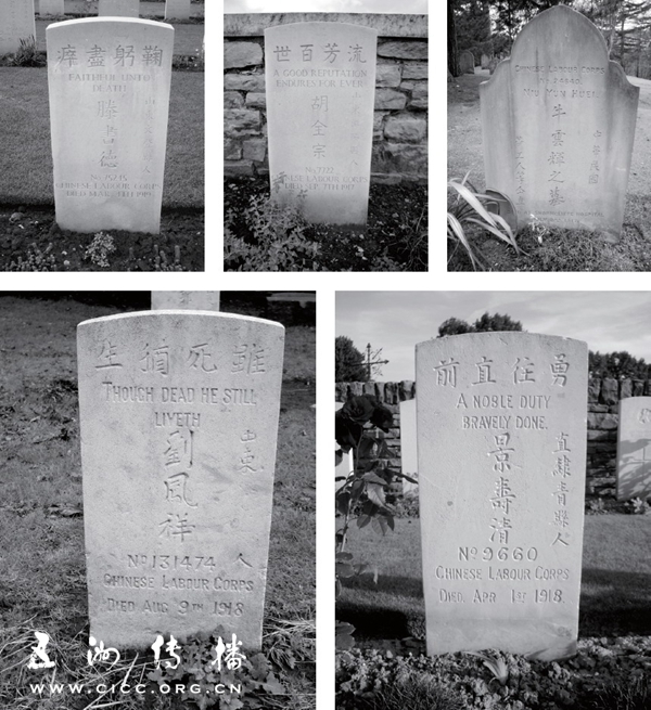 华工墓碑组图。在众多捐躯欧洲的一战华工的墓碑上,大多刻有下列四个成语中的一个:勇往直前、鞠躬尽瘁、虽死犹生、流芳百世