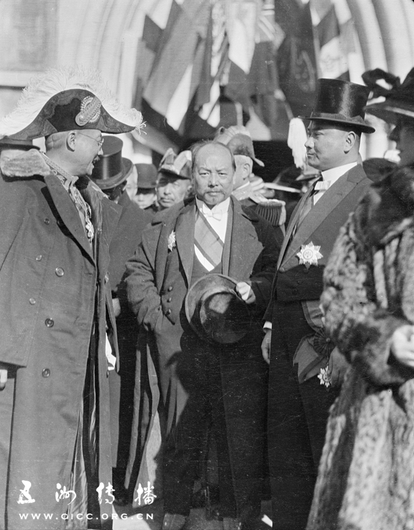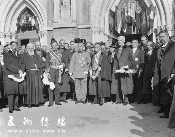 1918 年11 月13 日,中国政要及外国使节在北京出席庆祝第一次世界大战结束典礼。上图中为派华工参战的主要决策者、参议院院长梁士诒;下图拄拐杖者为前国务总理段祺瑞