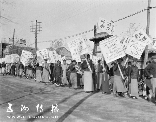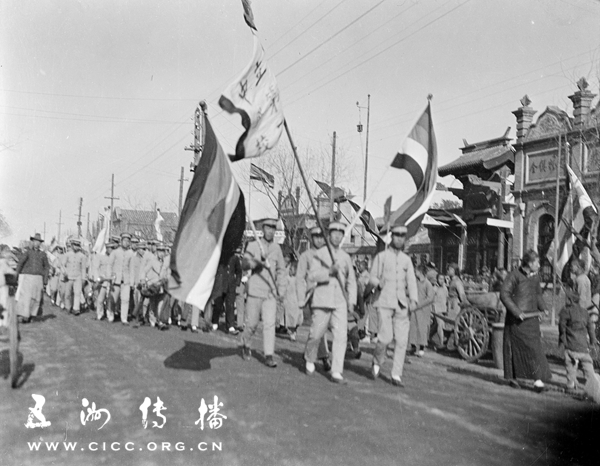 1918 年11 月14 日,在北京天安门召开庆祝大会。上图为警察学校学警举着北洋政府五色旗上街游行;下图为游行队伍中的基督教青年会学生