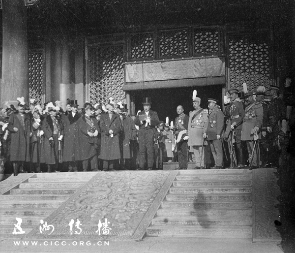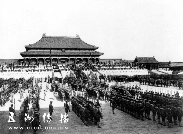 1918 年11 月28 日,世界和平庆贺日,北京政府当时的总统徐世昌在太和殿前举行大阅兵,并设宴招待各国公使,鼓吹“公理战胜强权”