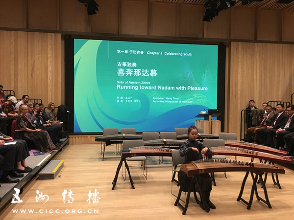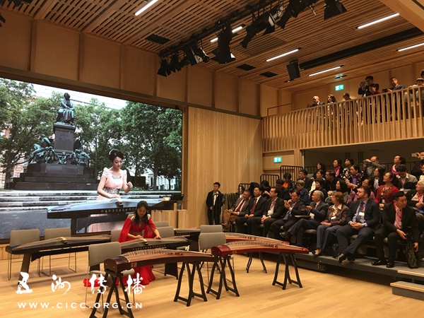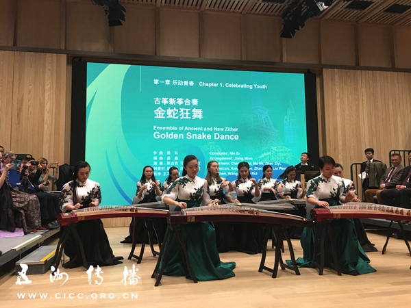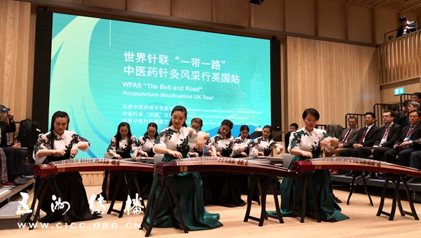 随后,2018世界中医针灸健康艺术节英国站“传承针艾·青春风采”点燃了整场活动的气氛。由中国东方乐团带来的音乐表演以中国传统民乐诠释中医药针灸在新时代变化、传承、融通、发展的轨迹以及不断求索、目旨四海的跃动活力。整场演出分为三个篇章:“乐动青春”、“心系家乡”和“东西对话”。《金蛇狂舞》、《喜奔那达慕》、《故乡行》等中国民乐经典曲目让观众领略到中华河山之美、人文之美。而用古筝、新筝演绎的世界名曲《献给爱丽丝》和英国流传度甚广的民歌《斯卡布罗集市》则展示了中西方文明互学互鉴、共放异彩的意涵,乐曲声甫一响起立刻迎来阵阵掌声。