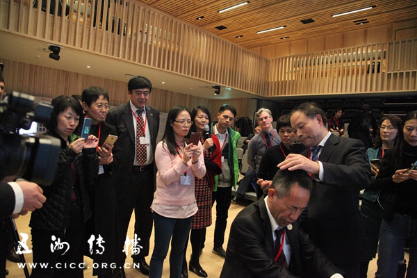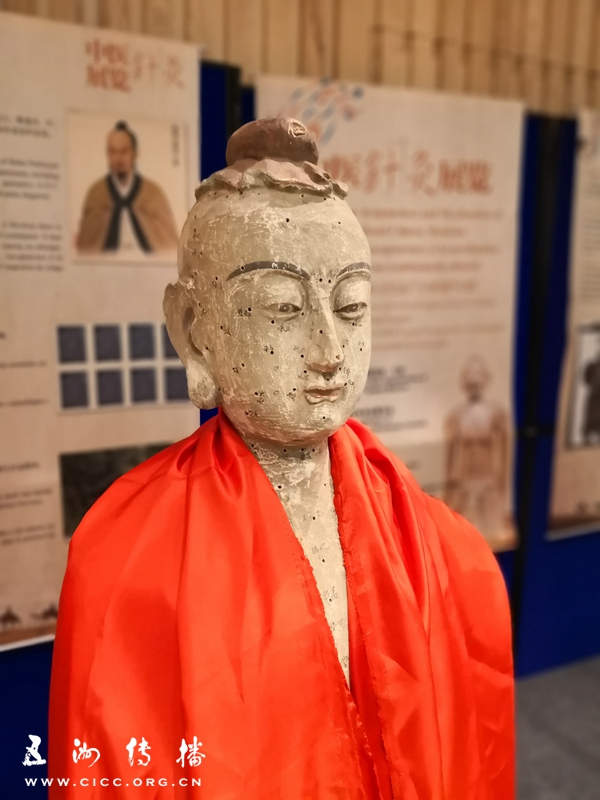 开幕式上,到场中外嘉宾首先为一尊英国收藏的古代针灸木人像揭开“神秘面纱”,中医针灸非遗文化展正式开幕。