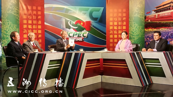 本书主编陆树林大使在接受巴国家电视台“中巴经济走廊时间”栏目专访时向观众介绍该书