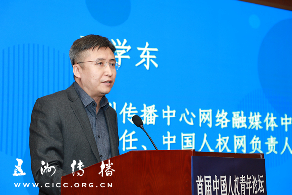 五洲传播中心网络融媒体中心副主任于学东在首届中国人权青年论坛闭幕式上致辞(摄影:焦飞)