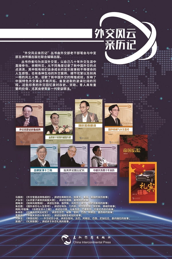 “外交风云亲历记”系列丛书由外交部老干部笔会精心挑选并推荐会员的优秀作品,与中宣部五洲传播出版社联合编辑出版。丛书作者均为资深外交官,以自己几十年外交生涯中直接参与、亲眼所见,从不同角度记录了新中国外交的点点滴滴,其中既有他们自身成长的苦乐故事和不辱使命的人生感悟,也有各种生动的外交案例、细节花絮以及别具一格的风土人情,讴歌了新中国外交的辉煌成就,反映了中国特色外交事业不断开拓、奋发进取的波澜壮阔的历程。这些珍贵的外交回忆录对存史、资政、育人具有重要的价值,尤其会使青年一代受益匪浅。