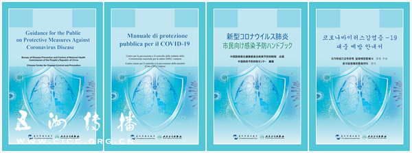 《新型冠状病毒肺炎公众防护手册》英、意、日、韩文版(从左至右)