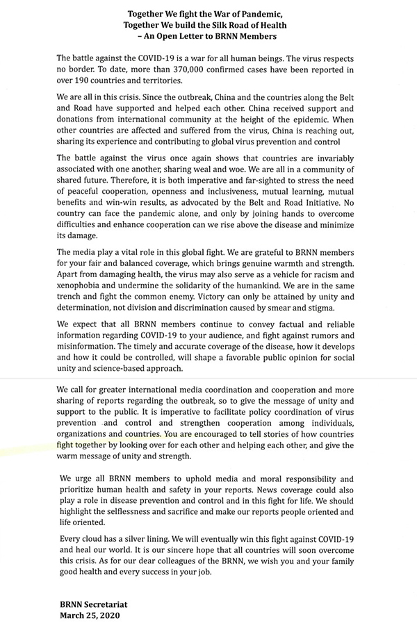 在这场全人类与病毒的斗争中,媒体发挥着至关重要的作用。我们要真诚感谢“一带一路”新闻合作联盟成员所进行的客观公正的报道,所带来的温暖和力量。病毒不仅危害人类身体的健康,也可能危害人类社会的团结,成为种族主义和排外情绪的借口。疫情当前,我们彼此都是伙伴和战友,病毒才是全人类共同的敌人,对不同社群的抹黑和污名化只会徒增对立和歧视,延误防控的良机;团结协作,携手抗疫,才能拥抱胜利。