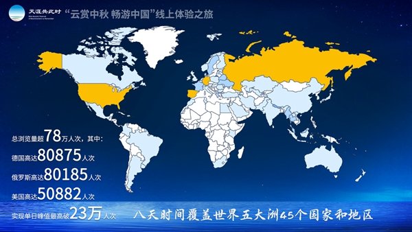 活动创新性的体验方式成为此次文化周的热点,被来自亚洲、欧洲、美洲等国家和地区的45家驻外机构选取使用。在短短几天的活动时间里,吸引了近百万人次的海外民众参与、体验,得到各国网民的好评,尤其在德国、俄罗斯、美国、西班牙、新加坡等国,成为最受欢迎的中秋活动之一,活动得到文化和旅游部驻外文化和旅游机构总部的高度评价。