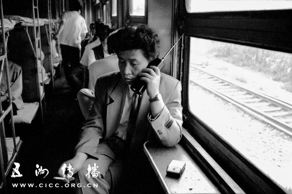 20世纪90年代初期,“大哥大”刚刚在中国大陆开始出现,是少数人才能拥有的奢侈品,也是一个社会人的身份象征。人仿佛是奇怪的生物,要靠外在的物品来印证自己的气质和派头。图为坐在卧铺车厢穿着未摘掉标牌的西装的生意人。