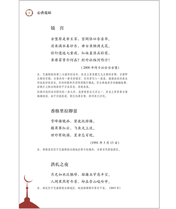 《心香花环》是原驻特立尼达和多巴哥、巴基斯坦大使陆树林的诗歌和文集。作者是新中国成立以来第一批学习英语和乌尔都语的学者,同时在工作之余创作了不少隽永诗文。作者将诗歌融入到对巴工作中,在巴基斯坦社会各界广泛开展“诗歌外交”。本书用生动的文笔叙述了中巴两国间外交方面的轶闻趣事,记录了为中巴外交做出历史贡献的相关人物,并展示了巴基斯坦的深厚而独特的地理、历史和文化等内容。巴基斯坦人民常向尊贵的客人或远道回归的亲人献上花环,因此书名定为“心香花环”。本书既是作者文学创作的阶段性总结,也是中巴两国人民友谊的珍贵回忆和历史见证。