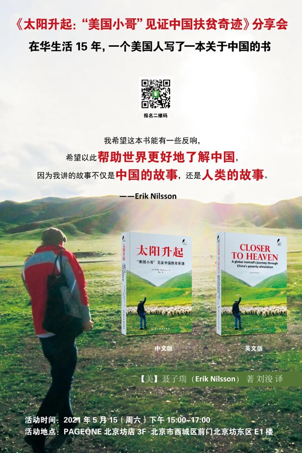 2021年5月15日,周六下午3点,五洲传播出版社将在在PAGEONE北京坊店举办《太阳升起:“美国小哥”见证中国扶贫奇迹》分享会,Erik将与几位嘉宾一起,与读者们分享书中的故事。