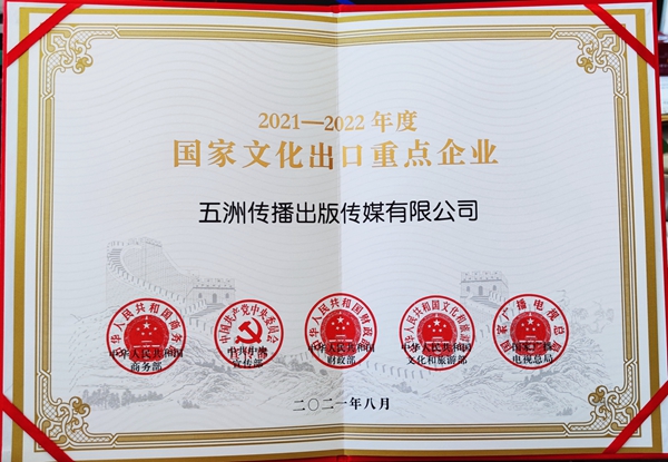 近日,由商务部、中宣部、财政部、文化和旅游部、国家广播电视总局联合评选的“2021-2022年度国家文化出口重点企业”名单正式公布,五洲传播出版传媒有限公司再获殊荣。截至今年,五洲已连续六届获评国家文化出口重点企业。