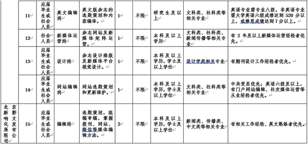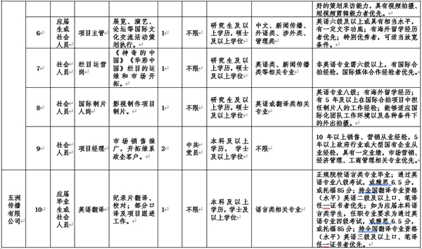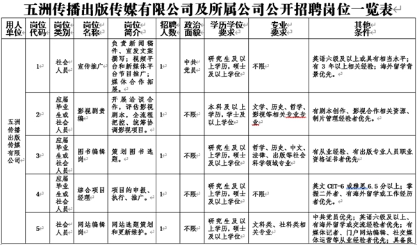 本次共招聘17名工作人员,详见附件“五洲传播出版传媒有限公司及所属公司公开招聘岗位一览表”。