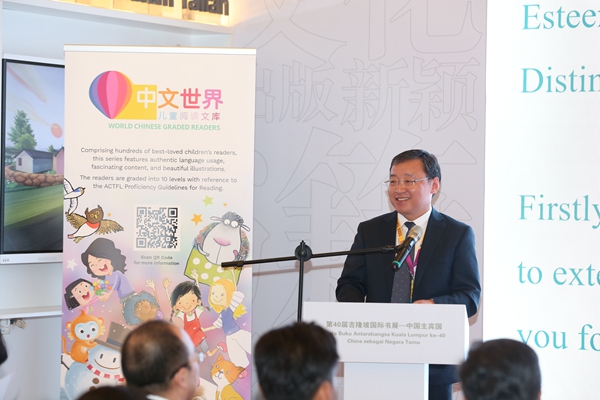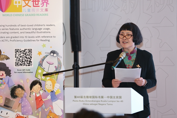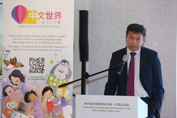5月28日下午,五洲传播出版社与美国圣智学习出版集团在吉隆坡国际书展中国主宾国活动区举行了“中文世界”儿童阅读文库成果发布仪式。中宣部进出口管理局一级巡视员、副局长赵海云、五洲传播出版社社长董青、圣智学习亚洲董事总经理李联和、中宣部出版局图书处处长王为衡、学习出版社副总编辑刘向军、著名儿童文学作家保冬妮、华东师范大学出版社总编辑龚海燕等多家国内出版社代表出席,共同为项目成果揭幕。