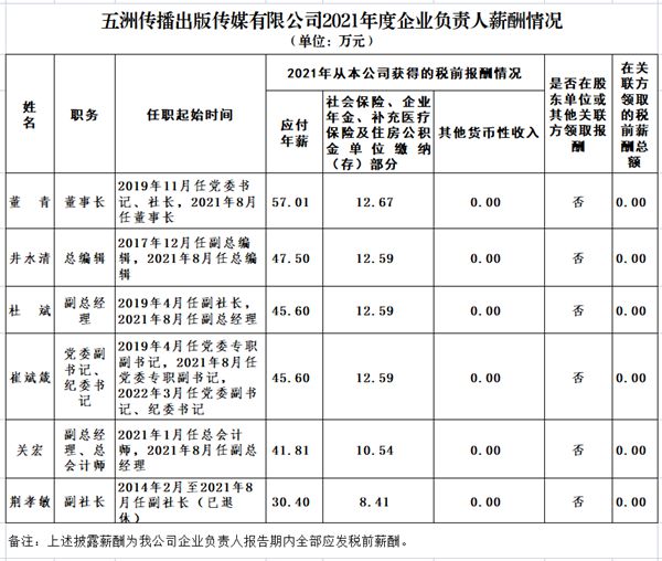 五洲传播出版传媒有限公司2021年度企业负责人薪酬情况