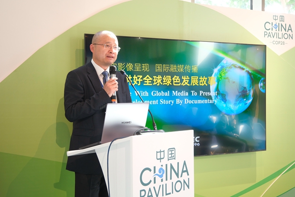 12月3日,“气候影视公益传播”边会在“中国角”举行,这是本次“中国角”举办的唯一一场影视相关主题活动,联合国前副秘书长刘振民、联合国框架公约组织前执行秘书Yvo de Boer、绿色地球基金会理事长、联合国环境规划署巴黎办公室前主任Rajendra Shende等国内外嘉宾参会致辞,五洲传播中心总编辑井水清应邀围绕“合作讲好全球绿色发展故事”进行主题演讲。