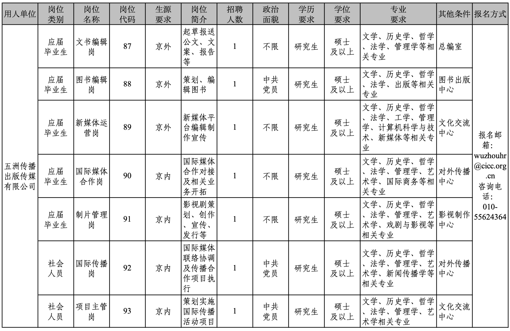 2月26日,中国文明网发布《中央宣传部直属单位2024年度公开招聘工作人员公告》,拟公开招聘工作人员,其中包括五洲公司7个岗位(87至93岗),有意报考者请下载报名表,填表发送至wuzhouhr@cicc.org.cn。