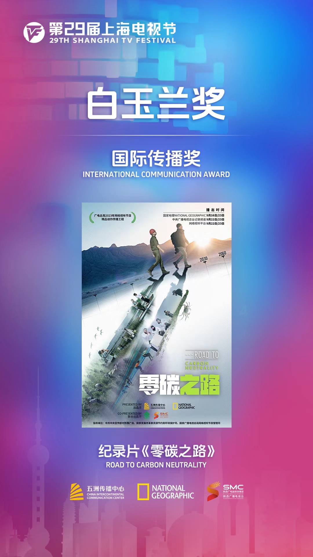 6月28日晚,在第29届上海电视节白玉兰颁奖礼上,由五洲传播中心和国家地理共同策划制作的纪录片《零碳之路》荣获白玉兰奖国际传播奖。