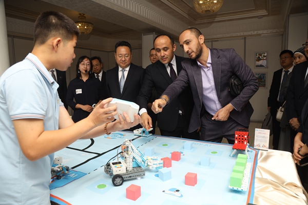 活动伊始,到场嘉宾共同参观了“未来世界”国际青少年艺术作品展和“未来视界”数智文创展。本次艺术作品展汇聚了中国、乌兹别克斯坦及全球其他国家逾三百件青少年及青年艺术家的作品,涵盖绘画、书法和工艺美术等多个类别。作品题材多元,涉及科技创新、文化遗产保护与传承、文明多样性与交流互鉴、全球共同议题等主题。年轻的创作者们运用独特的视角、鲜明的色彩描绘内心的无限憧憬与想象,表达出对未来世界的多维探索和深刻思考。