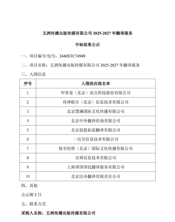 五洲传播出版传媒有限公司2025-2027年翻译服务中标结果公示