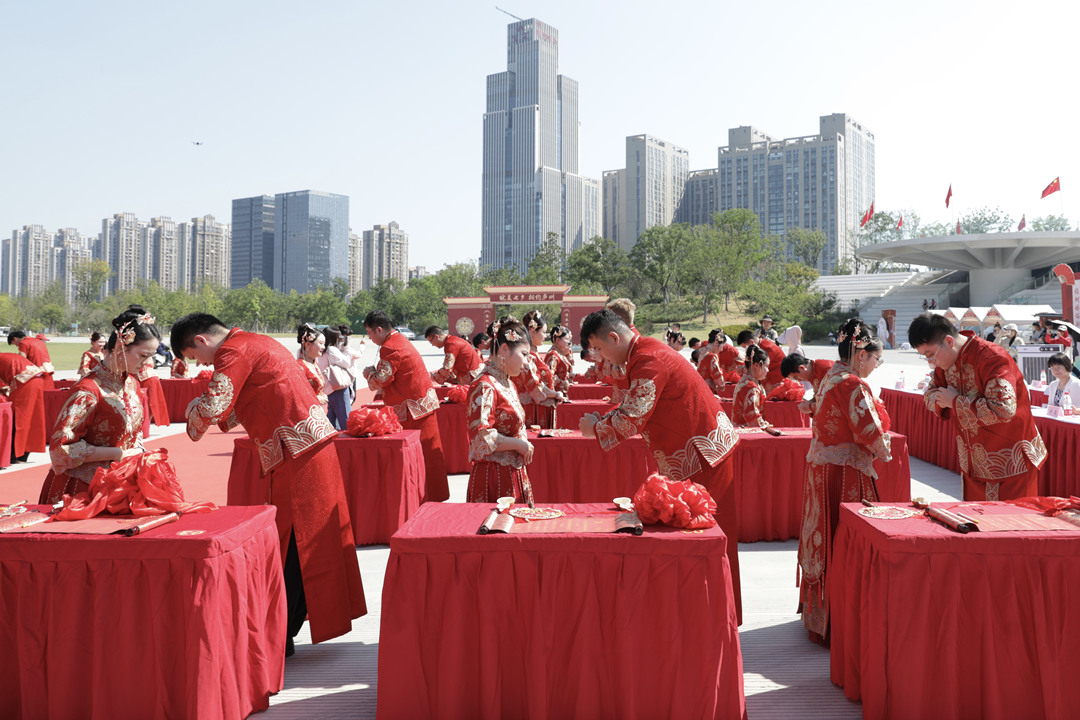 29对新人身着中式婚服,在传统婚仪中缔结良缘,以简约典雅的方式诠释新时代婚俗新风。现场每一处细节都体现了对新人美好未来的祝福和对文明婚恋的倡导,不仅为新人打造了难忘的婚礼记忆,更让“文明婚恋”的种子在人们心中生根发芽。“在七夕节这个特殊的日子里,和这么多新人一起分享幸福,意义很特别。祝福大家都收获爱情,生活美满。”一对新人王路成、邢榴榴激动地说。
