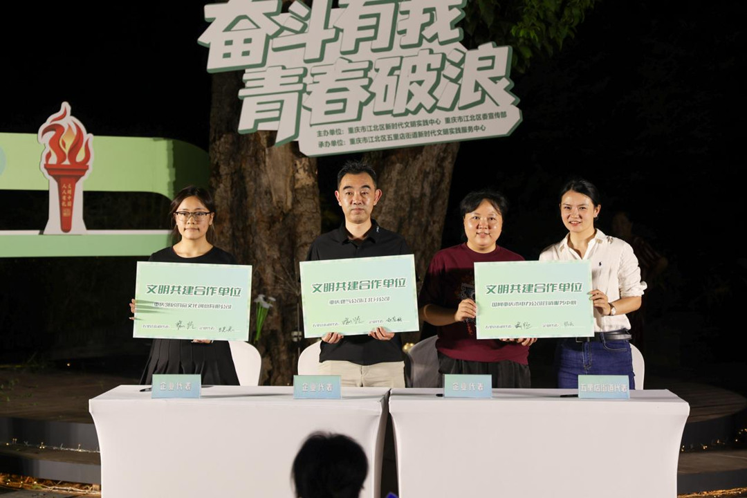 国网重庆市电力公司、重庆燃气集团江北分公司、重庆邻居的窗文化创意有限公司等企业代表与五里店街道新时代文明实践服务中心签署了《企业文明共建倡议书》。笔尖落下的瞬间,不仅是对江北文明建设的庄严承诺,更是政企携手、为青年成长和文明实践保驾护航的新起点。