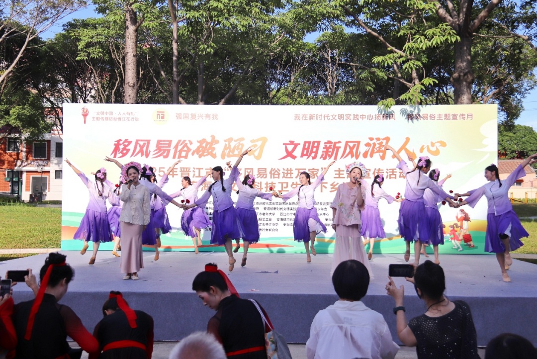 晋江市青年艺术团带来的舞蹈《花开中国》,以灵动舞姿勾勒祖国繁花似锦的景象,寓意文明新风如鲜花般绽放;晋江市高甲柯派表演艺术中心的闽南答嘴鼓《守约无陋俗 风清气自来》以诙谐对白讲“明礼”,赞扬生动表演讲述“遵守约定破陋习”的故事,让移风易俗道理更接地气;歌伴舞《孝敬父母》用温情表演传“孝道”,小提琴与诵读《推动移风易俗 倡导文明新风》以优雅形式倡“新风”,让移风易俗理念随艺术表演深入人心。