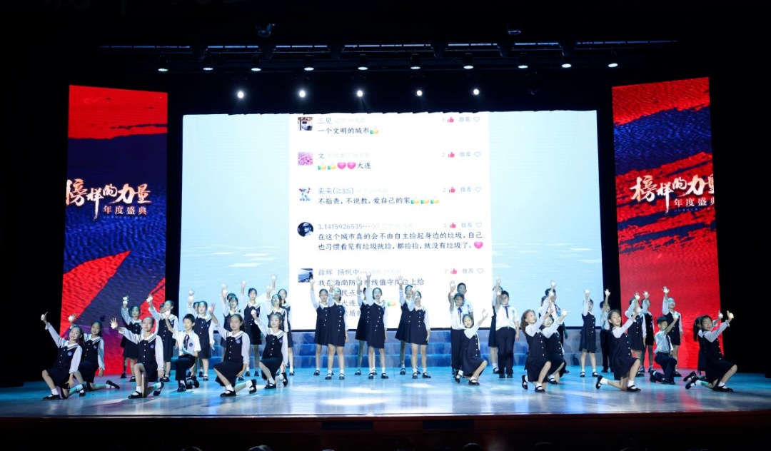 大连市中山区秀月小学合唱团演唱《世界赠予我的》,现场大屏幕播放市民网友的感人留言,传递榜样的力量和文明的感动。大连市文明办供图