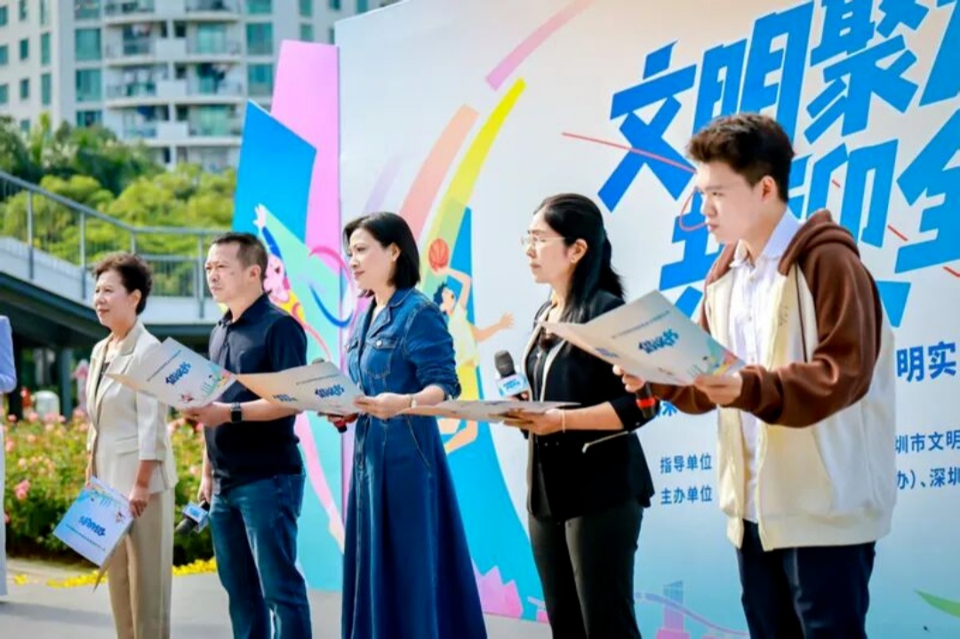 快闪之后,女子围棋世界冠军徐莹、全国文明家庭代表郭丽英、广东省最美志愿者代表黄国成、深圳垃圾分类蒲公英志愿讲师王芸、深港青年学生代表张谷琦五位嘉宾共同登台,齐声诵读《迎十五运会和残特奥会文明倡议书》。