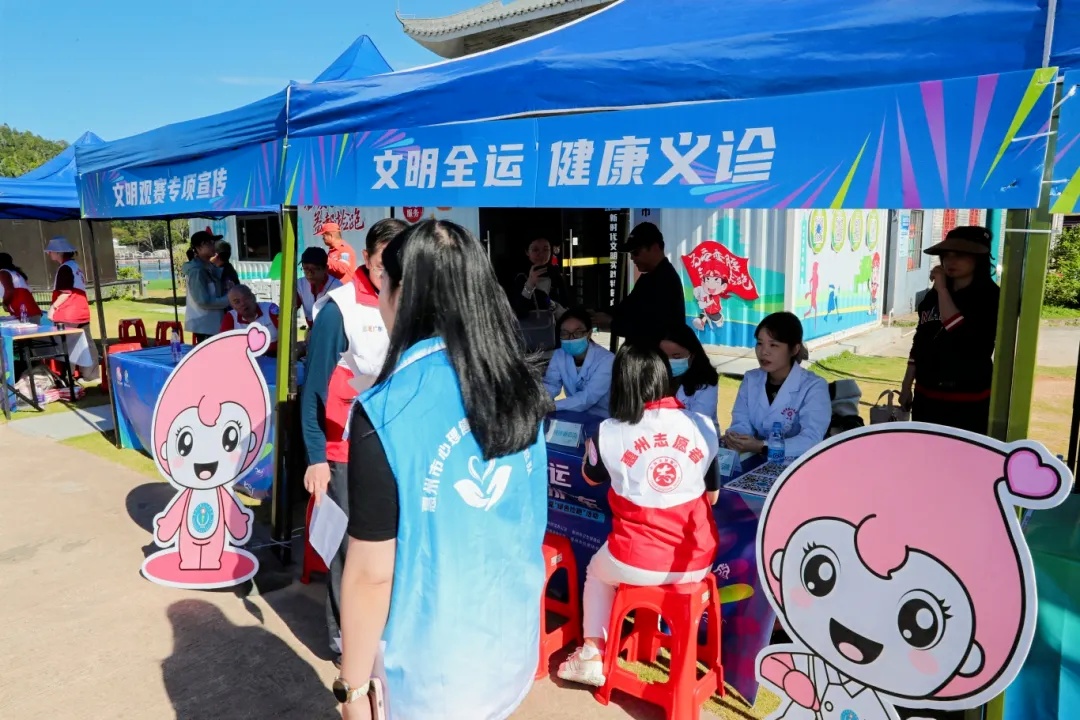 除了激情四射的捡跑,活动现场设置的“文明全运健康义诊”摊位也吸引了众多市民。惠州市第二人民医院组建的专业医疗团队,提供了集“专业诊疗、健康宣教、运动防护”于一体的服务,巧妙对接了全民健身和赛事保障的健康需求。